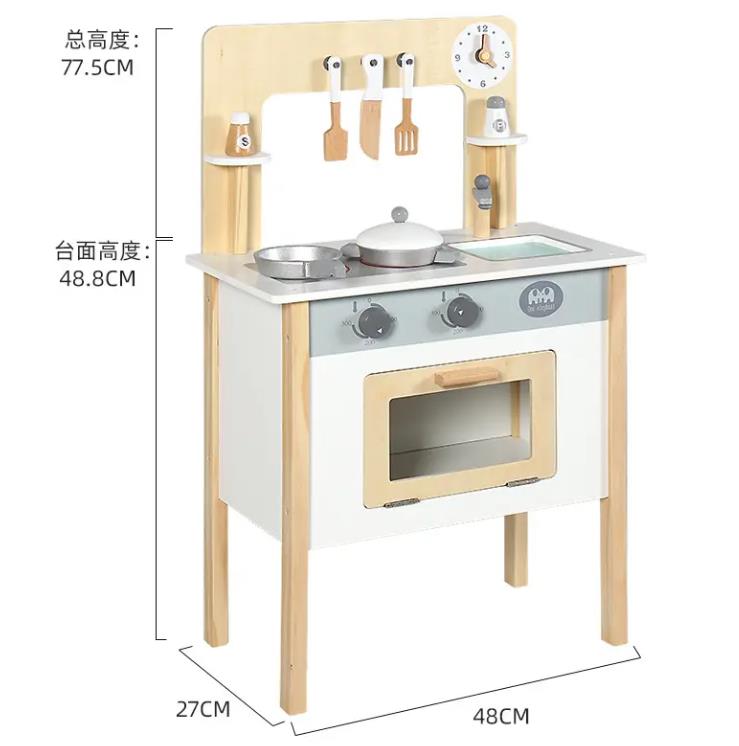 * Wooden Play Kitchen: Made of eco-friendly, solid wood, BPA-free. This space-friendly toy kitchen is 45in high and 40 in length after being assembled. Great for a cute nursery, let kids put the chef hat on and cook a meal for their guests.